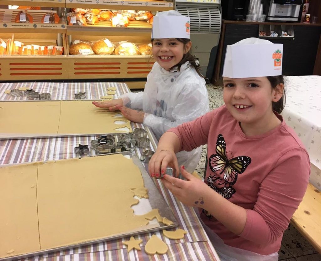 Amelie Wecker (vorne) und Lilly Becker (hinten) haben viel Spaß beim Ausstechen ihrer Plätzchen.